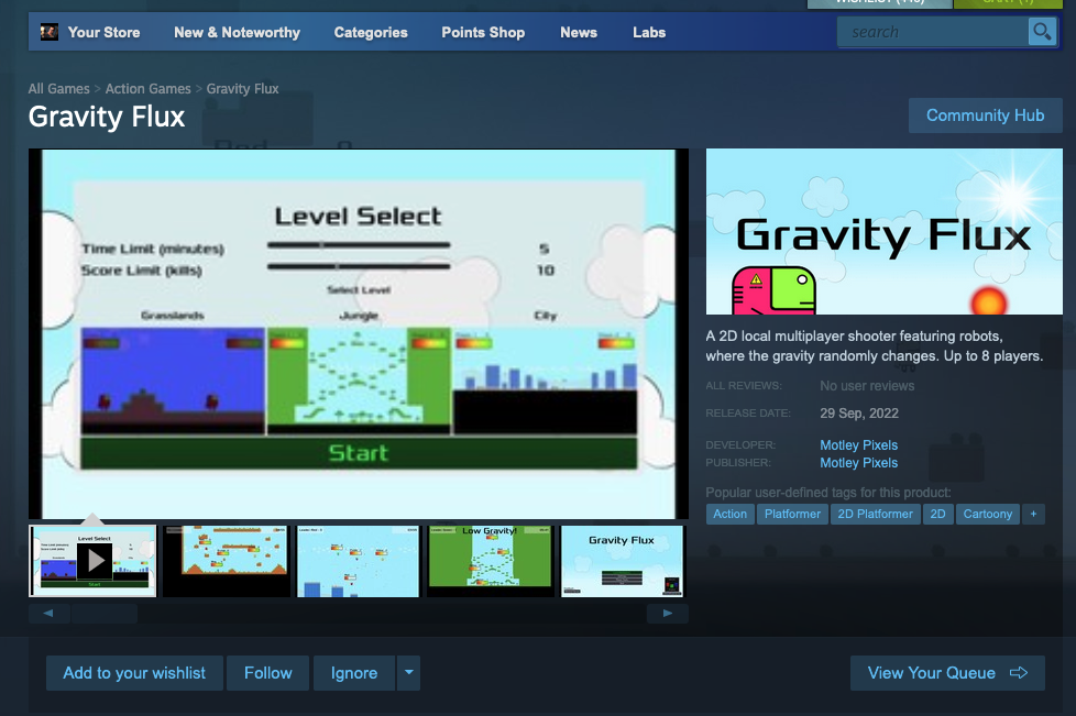 Motley Pixels is the psuedo-game-company name for Leo’s game-making psuedo-business. Motley Pixels makes a variety of games, for a fairly broad audience, not sticking to specific niches necessarily, but aiming for more of a “fun-for-all” approach. That’s the plan so far anyway. Sometimes I do game jams, where all kinds of concepts get attempted. The goal is to make games and release them on major platforms, Steam notably but others would be nice as well.