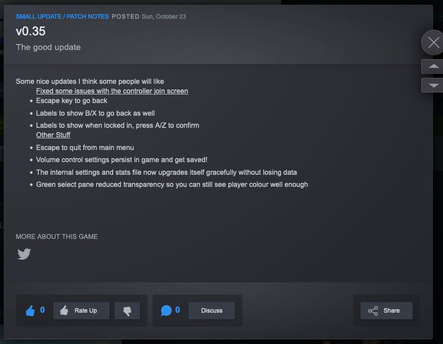 - Fix bug where one controller doesn’t work in controller join menu (need physical gamepads to test)