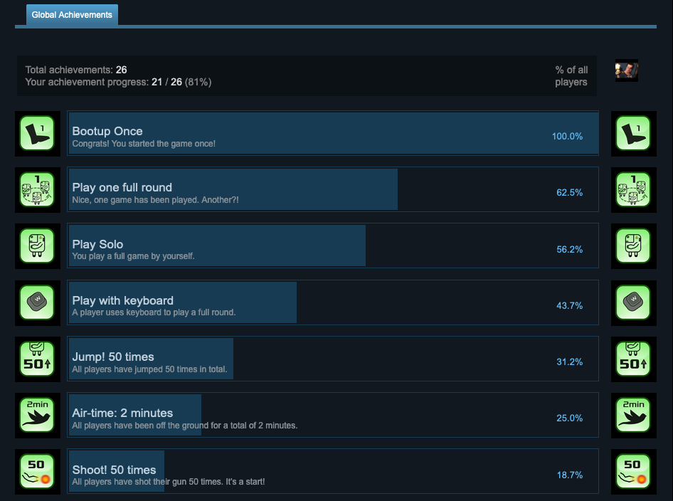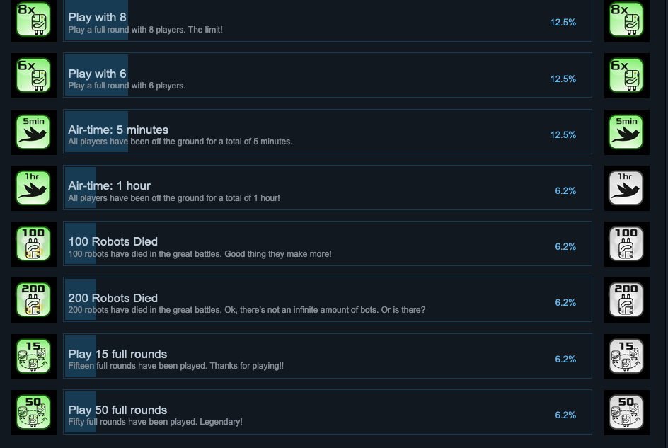 The remainder to-do list is getting a lot smaller.. Just forgot to get the stats page working, and finishing up the achievements. Then upload to Steam